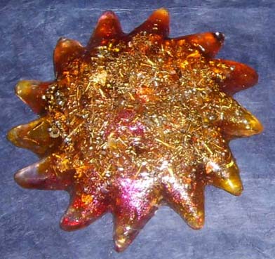 | Technique mixte Résine & Orgonite Titre: Soleil Technique: Orgonite (selon l'inspiration du moment..) mélange de laiton, alu, cuivre, feuille d'or, cristal, améthyste, aventurine, jaspe, cornaline, quartz rose, hematite, oeil de tigre, grenat, pyrite, malachite, lapis lazuli, perle, nacre, coquillage, étoile de mer, brindilles et cadeaux de la forêt.. dans matrice en résine époxy Format: Ø 12cm - 4.7inch Prix: € $ CHF 222.- pour acquérir une de ces pièces: ---> >ciquez ici