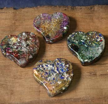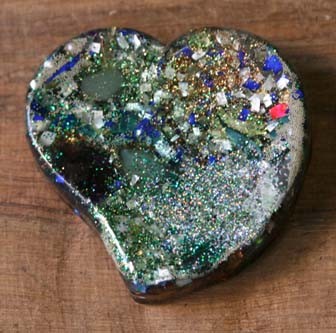 | Technique mixte Résine & Orgonite Titre: Coeur sur la main Technique: Orgonite avec (selon l'inspiration du moment..) mélange de métaux: laiton, alu, cuivre, feuille d'or d'argent de cuivre, de pierres fines: cristal, améthyste, aventurine, jaspe, cornaline, quartz rose, hématite, oeil de tigre, grenat, pyrite, malachite, lapis lazuli, turquoise, perle, nacre, coquillage, étoile de mer, brindilles et cadeaux de la forêt.. dans matrice en résine époxy Format: 8x9cm - 3.2x3.5inch Prix: € $ CHF 155 pour acquérir une de ces pièces: --->>ciquez ici